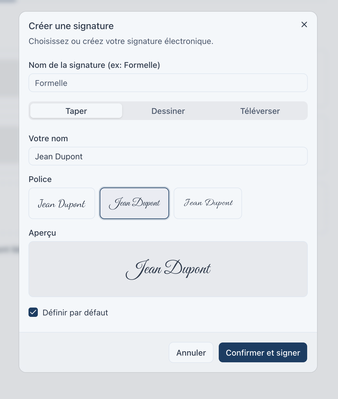 Une fois votre signature enregistrée, cochez « Définir par défaut » et c'est réglé. La prochaine résolution à signer, ça prend deux secondes.