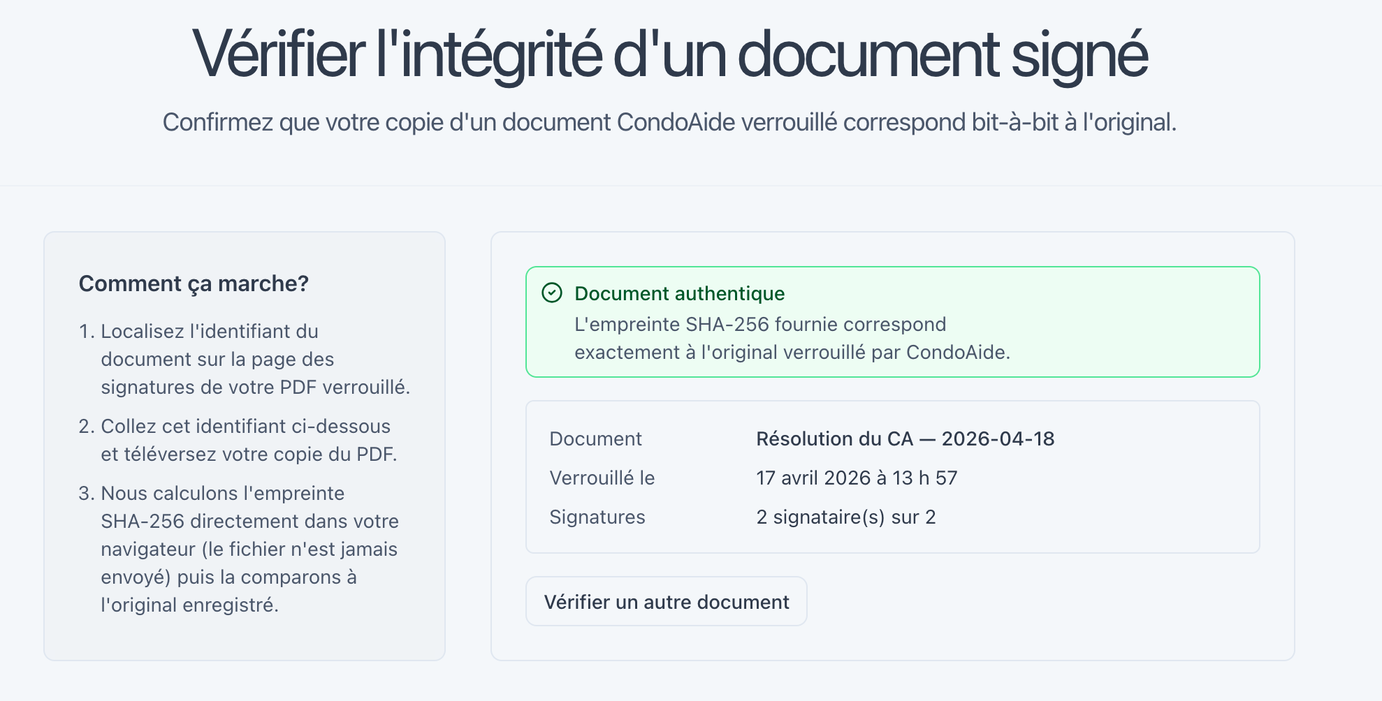 Ça se passe à condoaide.ca/verifier. Vous téléversez le PDF, on calcule son empreinte, et on la compare avec notre registre.