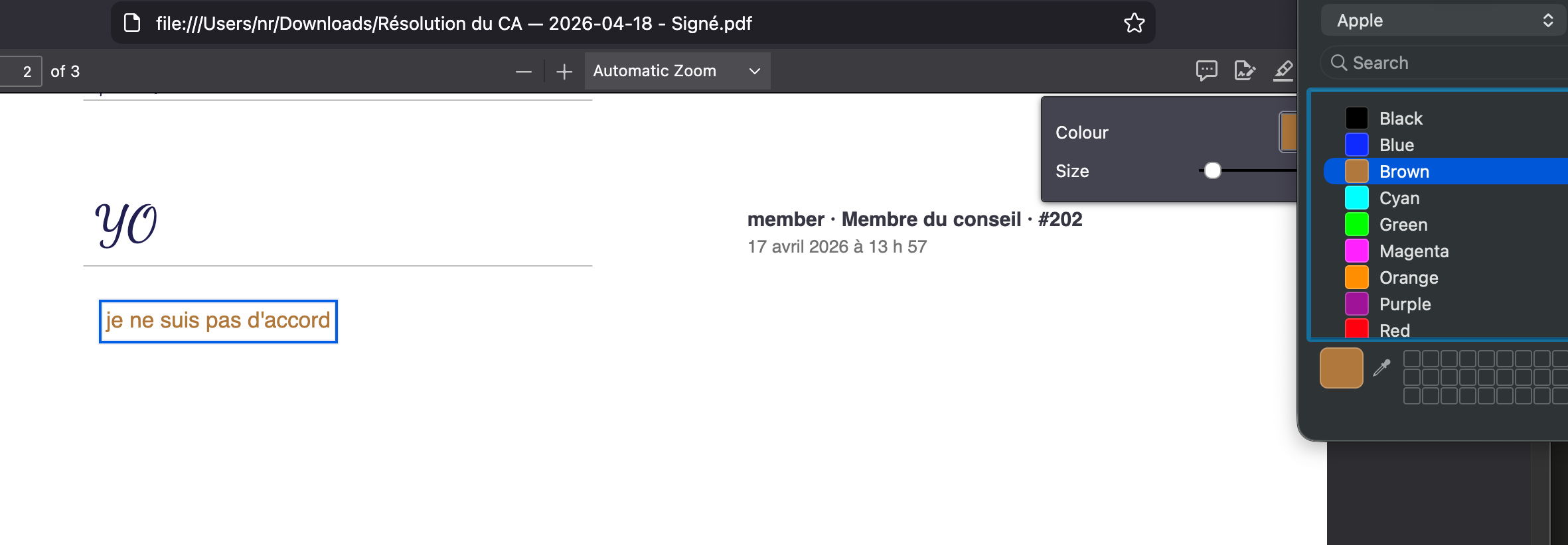Disons qu'un administrateur mécontent récupère le PDF signé, l'ouvre dans un visualiseur et griffonne « je ne suis pas d'accord » en marge, puis le transmet à un autre copropriétaire en prétendant que c'est le document original :