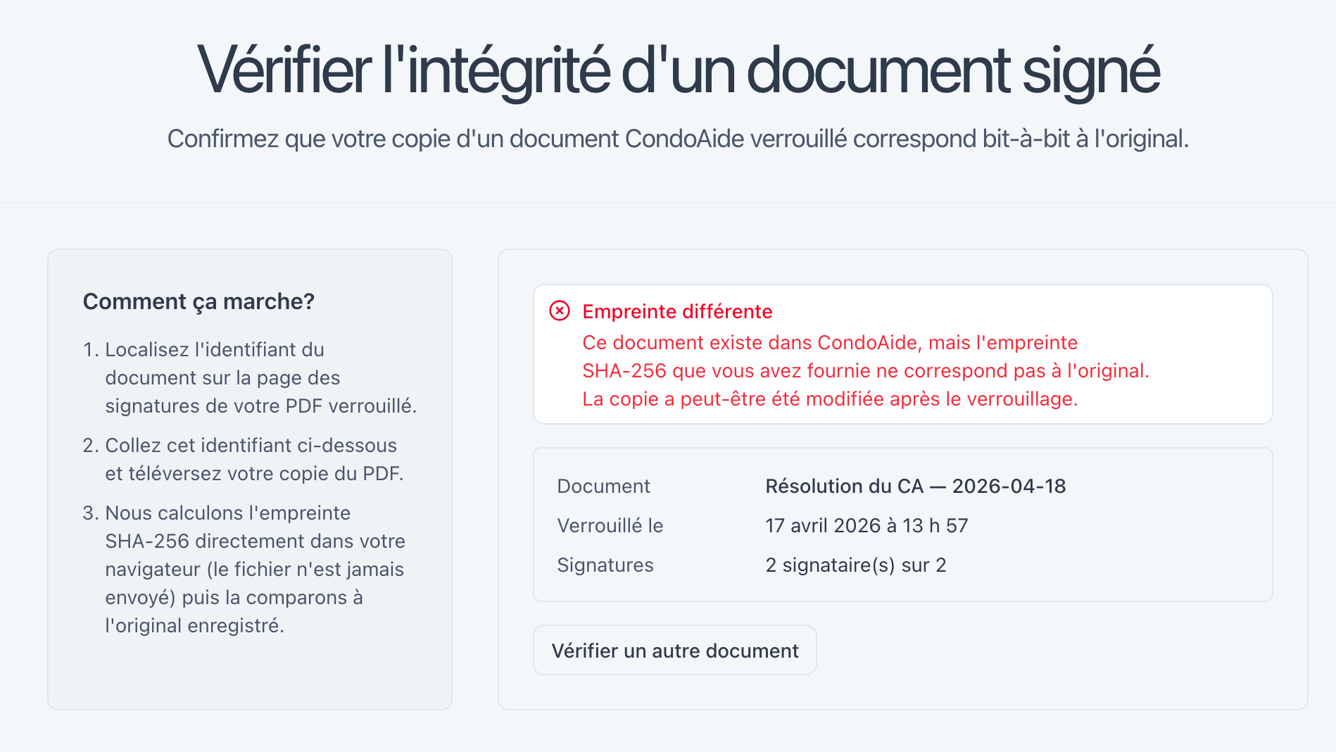 La page n'accuse personne — elle constate simplement que le fichier présenté n'est pas celui qui a été signé. Le document original existe bel et bien dans le registre, et CondoAide peut le ressortir. Toute modification faite après le verrouillage, même un simple ajout d'annotation, est détectable.